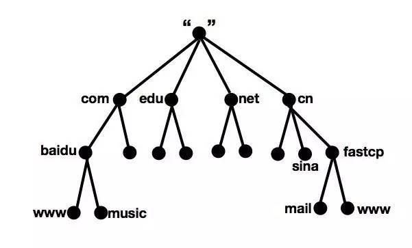 DNS 是以域名為索引的,域名是是由一串用“點”分隔的字符組成的Internet上某一臺計算機或計算機組的名稱,如下圖所示,域名的結(jié)構(gòu)為一顆倒立的樹,每個域名就是圖中的一個分支,這顆逆向樹就稱為域名空間。