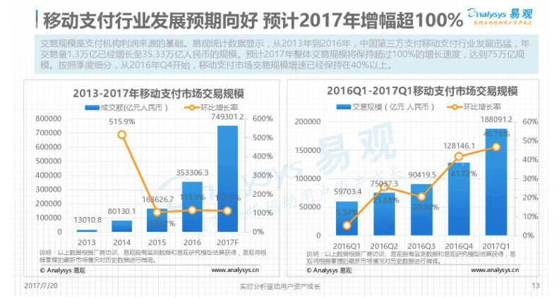 來自易觀的數(shù)據(jù)顯示,預(yù)計(jì)2017年第三方支付整體交易將保持超過100%的增長(zhǎng)速度,達(dá)到75萬億的規(guī)模。按照季度細(xì)分,從2016年Q4開始,移動(dòng)支付市場(chǎng)交易規(guī)模增速已經(jīng)保持在40%以上,增長(zhǎng)強(qiáng)勁。