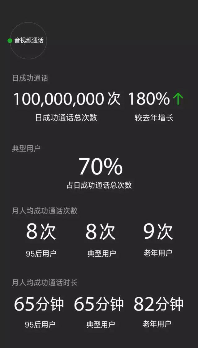 報告還顯示,微信的中老年用戶,平均每天發(fā)送 44 條消息,其中語言消息超過 1/5。在音視頻通話方面,老年用戶每月人均使用音視頻通話 9 次,人均時長達到 82 分鐘,超過 95 后以及 80、90 后典型用戶的 65 分鐘。在發(fā)紅包上,老年用戶每月人均發(fā)出 25 個紅包,金額為 380 元。