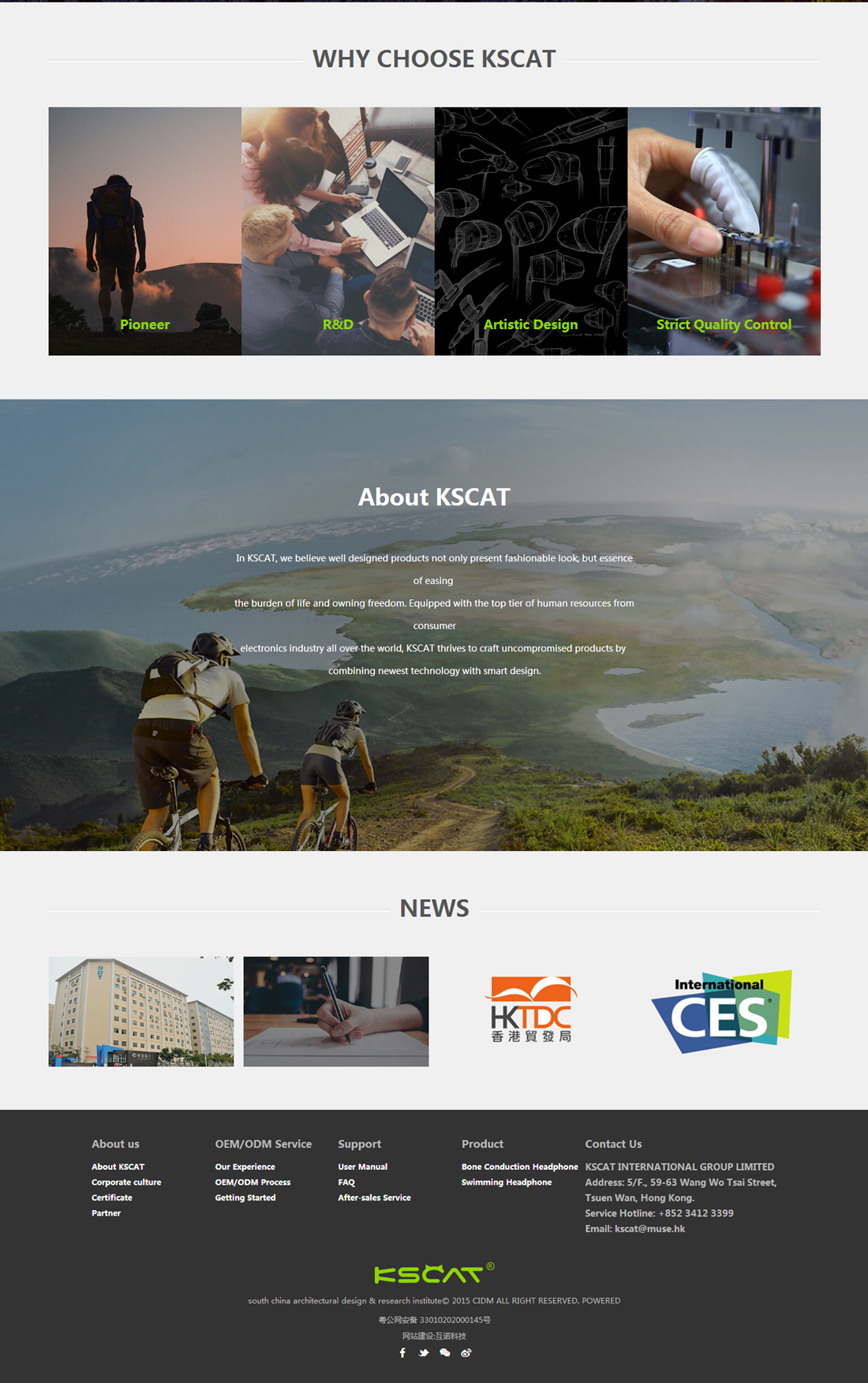 KSCAT INTERNATIONAL GROUP LIMITED is a leader of high-end consumer electronics & gadgets market. Integrated R&D, manufacturing and broad sales channels, we are specialized in making wireless sports headphones, wireless bone conduction head-phones and cycling headset, professional swimming waterproof headphones, portable sports earbuds, and other Bluetooth devices, etc. Our products obtain a good reputation of great quality and ergonomic design in domestic China and oversea market.